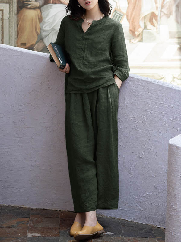2 Menit LaluSet 2 potong celana lebar kaki katun dan linen warna solid gaya Jepang yang elegan - beli satu gratis satu