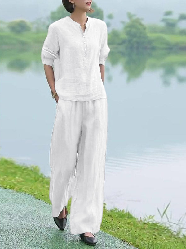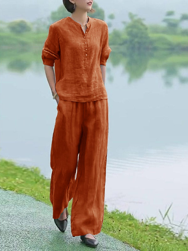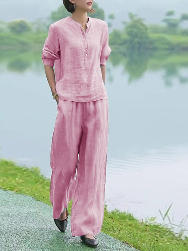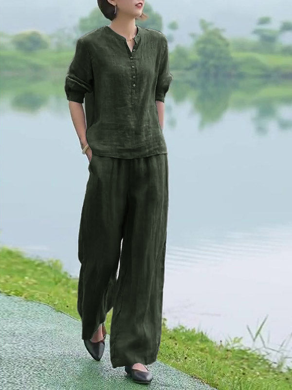 2 Menit LaluSet 2 potong celana lebar kaki katun dan linen warna solid gaya Jepang yang elegan - beli satu gratis satu