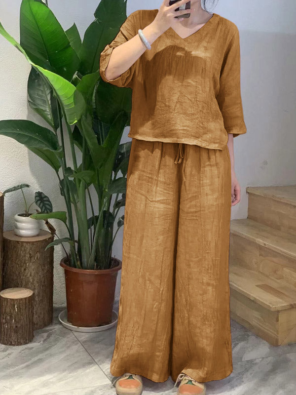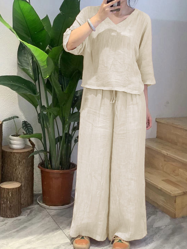 2 Menit LaluSet 2 potong celana lebar kaki katun dan linen warna solid gaya Jepang yang elegan - beli satu gratis satu