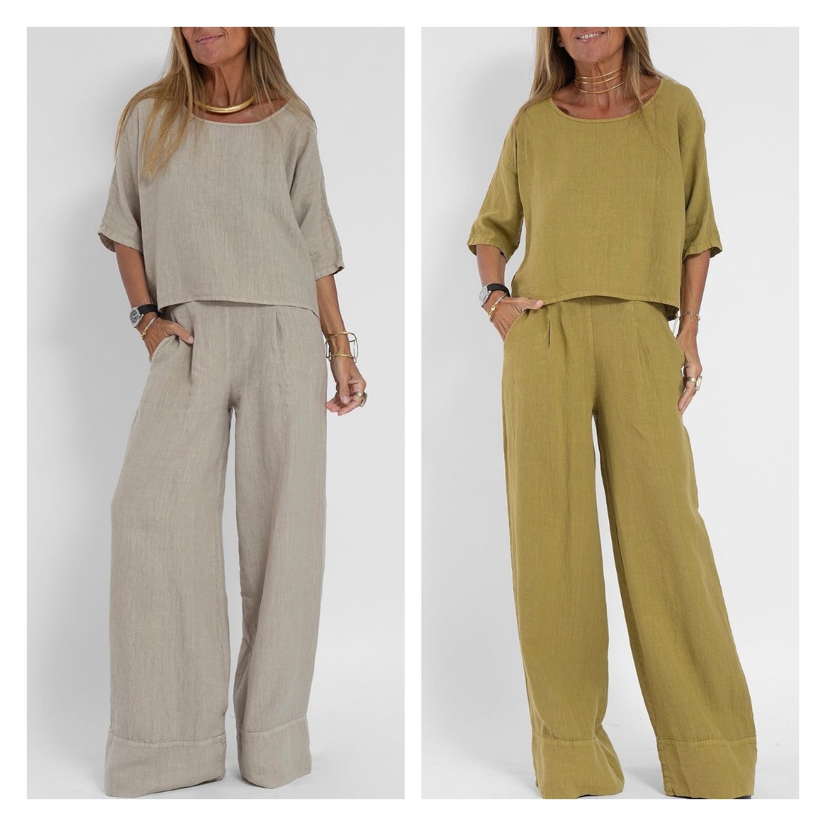 5 Menit LaluSetelan lengan tiga perempat katun linen warna solid busana kasual wanita - beli satu gratis satu