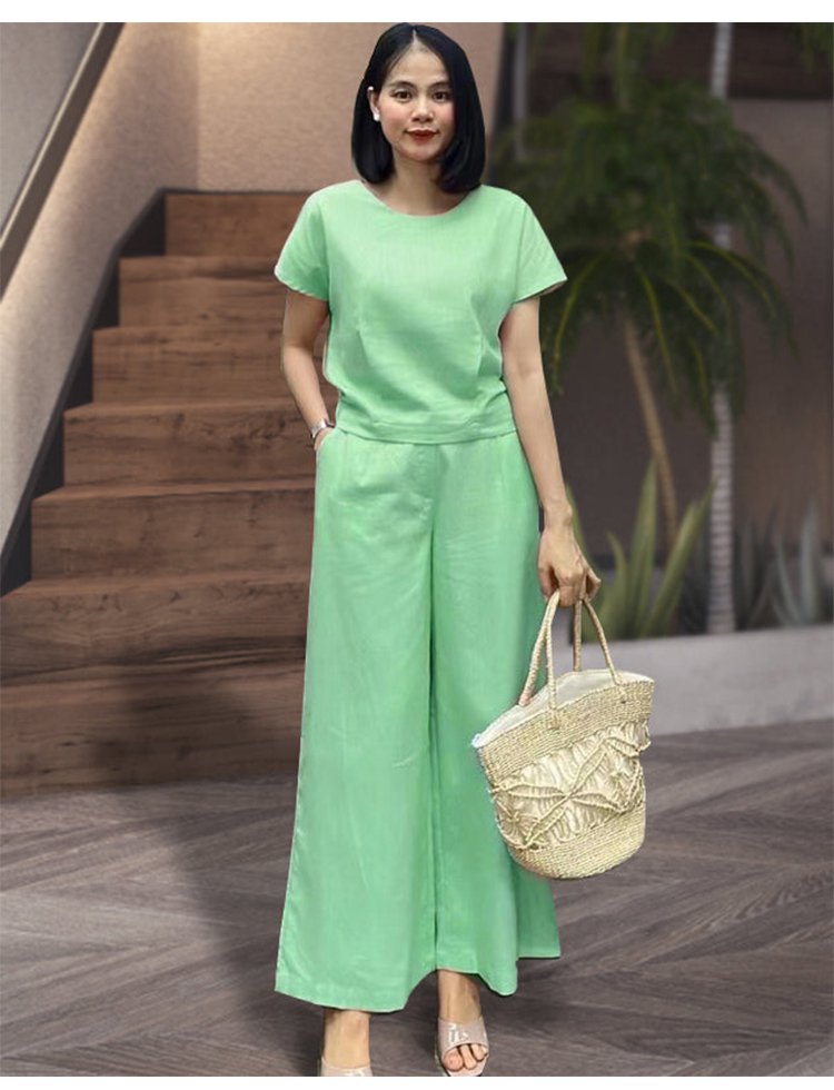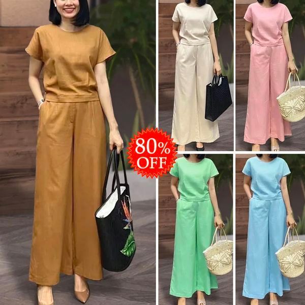 8 Menit LaluSet 2 potong celana lebar kaki katun dan linen warna solid gaya Jepang yang elegan